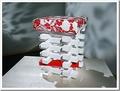 4. Приступим к обтяжке сиденья. Для этого используем белую ткань с красивым красным орнаментом, напечатанным с помощью горячего пресса – метода, благодаря которому ткань можно без проблем стирать. Обтягиваем тканью кусок поролона и прикрепляем ее мебельным степлером к квадрату из фанеры с двух сторон. Отрезаем все лишнее.